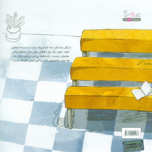 نویسنده : کلر ژوبرت تصویرگر : گلنار ثروتیان از اول زمستان دعا کردم برف بیاید و مدرسه تعطیل شود. چون یک روز تعطیل برفی مثل تعطیلیهای معمولی نیست. یکدفعه بیخبر، مثل یک هدیه مخصوص خدا، و این خیلی قشنگ است.