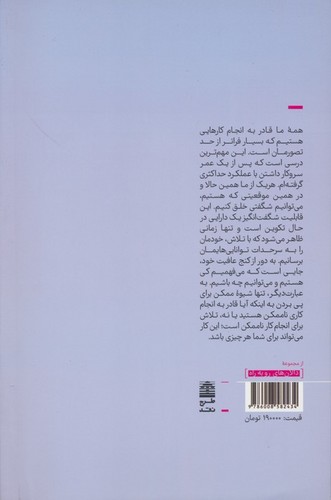 نویسنده : استیون کاتلر ترجمه : پویان کرمی همة ما قادر به انجام کارهایی هستیم که بسیار فراتر از حد تصورمان است. این مهمترین درسی است که پس از یک عمر سروکار داشتن با عملکردی حداکثری گرفتهام. هر یک از ما همین حالا ئ در همین موقعیتی که هستیم، میتوانیم شگفتی خلق کنیم. این قابلیت شگفتانگیز یک دارایی در حال تکوین است و تنها زمانی ظاهر میشود که با تلاش، خودمان را به سرحدات تواناییهایمان برسانیم. به دور از کنج عافیت خود، جایی است که میفهمیم کی هستیم و میتوانیم چه باشیم. به عبارت دیگر، تنها شیوة ممکن برای پی بردن به اینکه آیا قادر به انجام کاری ناممکن هستید یا نه، تلاش برای انجام کار ناممکن است؛ این کار میتواند برای شما هر چیزی باشد.