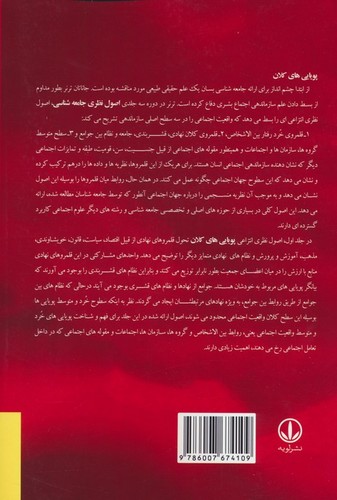 نویسنده : جاناتان اچ ترنر ترجمه : عادل ابراهیمیلویه و ... در جلد اول اصول نظری انتزاعی پویاییهای کلان تحول قلمروهای نهادی از قبیل اقتصاد، سیاست، قانون خویشاوندی، مذهب، آموزش و پرورش و نظامهای نهادی متمایز دیگر را توضیح میدهد. واحدهای مشارکی در این قلمروهای نهادی منابع باارزش را در میان اعضای جمعیت بطور نابرابر توزیع میکند و بنابراین نظامهای قشربندی را بوجود میآورند که بیانگر پویاییهای مربوط به خودشان هستند. جوامع از نهادها و نظامهای قشری به وجود میآیند. درحالی که نظامهای بین جوامع از طریق روابط بین جوامع، بهویژه نهادهای مرتبطشان ایجاد میگردند. نظر به اینکه سطوح خرد و متوسط پویاییها بوسیله این سطح کلان واقعیت اجتماعی محدود میشوند، اصول ارائه شده در این جلد برای فهم و شناخت پویاییهای خرد و متوسط واقعیت اجتماعی یعنی، رابط بین الاشخاص و گروهها، سازمانها، اجتماعات و مقولههای اجتماعی که در داخل تعامل اجتماعی رخ میدهند، اهمیت زیادی دارند.