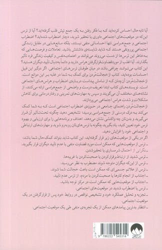 (غلبه بر اضطراب اجتماعی و جمعهراسی) نویسنده : بارباراجی مارکوی ترجمه : سارهسادات علوی این کتاب میتواند چراغی باشد در میان طوفان ترسهای اجتماعی. آیا تابهحال احساس کردهاید که با فکر رفتن به یک جمع تپش قلب گرفتهاید؟ آیا از ترس اینکه در موقعیتهای اجتماعی قضاوت یا تحقیر شوید، دچار اضطراب شدهاید؟ اضطراب اجتماعی و جمعهراسی تنها احساساتی منفی نیستند، بلکه موانعی در مقابل زندگی اجتماعی پررونقی هستند که شاید شایستهی داشتنش باشید. از خجالت مردن راهنمای جامعی در حوزهی اضطراب اجتماعی است که به شما کمک میکند به درک درستی از جمعهراسی برسید؛ تشخیص بدهید چگونه تحت تأثیر آن قرار میگیرید و بدنتان چه واکنشی نشان میدهد، اهداف و برنامههایی را برای ارزیابی و بهبود ترس خود تعیین کنید، یاد بگیرید چگونه با ترسهایتان روبهرو شوید و مهارتهای ارتباطی و اجتماعی خود را افزایش دهید. از مزیتهای این کتاب مثالهای متنوع و جداول تمرینی برای آموختن مهارتهای مورد نیاز است. مهارت اصلی برای مقابله با جمعهراسی، رویارویی نام دارد. از طریق رویارویی فرد یاد میگیرد که چطور پله به پله و به صورت طبقهبندی شده با ترسهایش مواجه شود و بتواند اختلال خود را بهبود ببخشد.