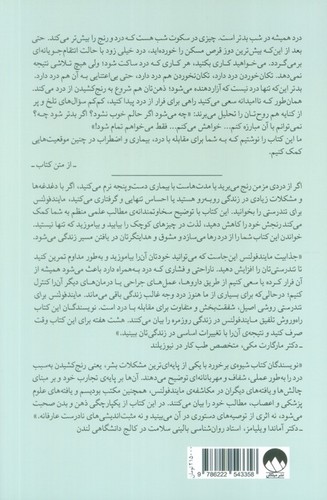 (راهنمای عملی برای تکسین درد ،کاهش استرس و بازیابی سلامت) نویسنده : ویدیامالا برچ ،دنی پنمن ترجمه : اورمزد اولیایی ،سولماز روشنمهر درد همیشه در شب بدتر است. چیزی در سکوت شب هست که درد و رنج را بیشتر میکند. حتی بعد از این که بیشترین دوز قرص مسکن را خوردهاید، درد خیلی زود با حالت انتقامجویانهای برمیگردد. میخواهید کاری بکنید، هر کاری که درد ساکت شود، ولی هیچ تلاشی نتیجه نمیدهد. تکان خوردن درد دارد، حتی بیاعتنایی به آن هم درد دارد. بدتر این که تنها درد نیست که آزاردهنده میشود، ذهنتان هم شروع به رنج کشیدن از درد میکند. همانطور که ناامیدانه سعی میکنید راهی برای فرار از درد پیدا کنید، کم کم سوال های تلخ و پر از کنایه هم روحتان را تحلیل می برند. چه میشود اگر حالم خوب نشود؟ اگر بدتر شود چه؟ نمیتوانم با آن مبارزه کنم... خواهش میکنم... فقط میخواهم تمام شود. ما این کتاب را نوشتیم که به شما برای مقابله با درد، بیماری و اضطراب در چنین موقعیتهایی کمک کنیم.