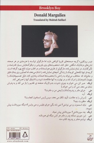 نویسنده : دونالد مارگولیز ترجمه : مهتاب صفدری پسر بروکلینی گرچه صحنههای تقریبا کوتاهی دارد، اما مارگولیز توانسته با هنرمندی در هر صحنه تنشهای دراماتیک شگفتی خلق کند، شخصیتهای وی باورپذیر و دیالوگ هایش بسیار قدرتمند و تأثیرگذارند. در تمام نمایشنامه مارگولیز از طنزی هوشمندانه و در اغلب موارد تلخ بهره گرفته است. گرچه او تنها تکههایی کوچک از زندگی آدمهای نمایشنامه را نشان میدهد، اما تصاویر وی چنان دقیق و جامعاند که مخاطب میتواند به راحتی با شخصیتها همذاتپنداری کند، دلیل تصمیمهایشان را بفهمد، اندوهشان را درک کند و در نهایت به آنها علاقهمند شود و با اشتیاق آنها را همراهی کند.