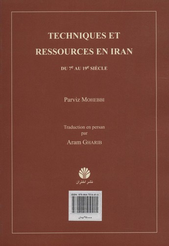 (مقدمهای بر تاریخ تکنولوژی و کاربرد مواد در ایران از قرن اول تاسیزدهم هجری) نویسنده : پرویز محبی ترجمه : آرام قریب در این کتاب، تاریخ تکنولوژی و کاربرد مواد در ایران از قرن اول تا قرن سیزدهم هجری بررسی گردیده است. موضوعات کتاب این عناوین را شامل میشود: "چرخ و ارابه"، "چوب"، "زغال سنگ و نفت"، "سنگ"، "آب"، "دستگاههای بالابری آب"، "آسیاها"، "کاربردهای دیگر آسیاب"، "ساعت مکانیکی"، "سیستم فنی ایران" و "قطعههایی از یک دست نوشته فنی".